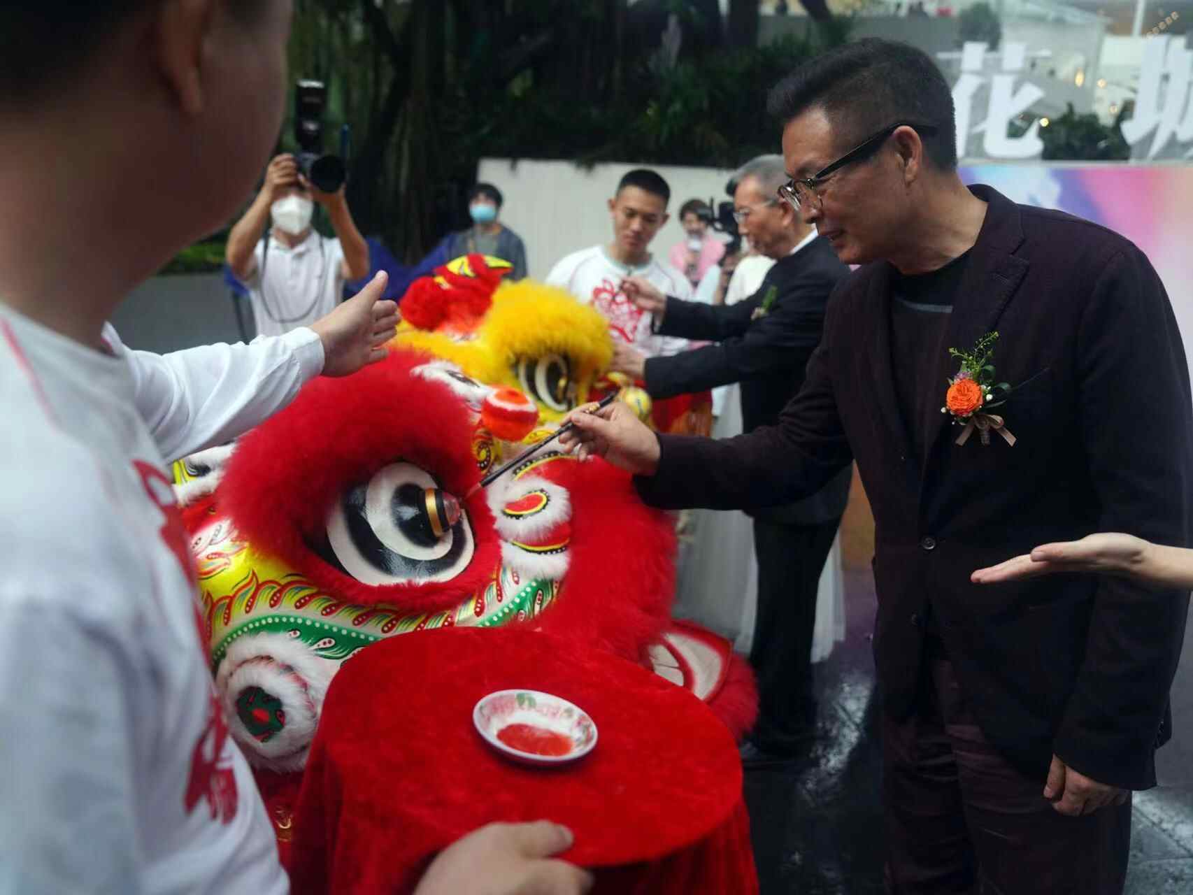 花城文学院揭牌仪式上联席院长麦家、陈晓明为醒狮点睛(羊城晚报全媒体记者 邓勃 曾育文 摄影)