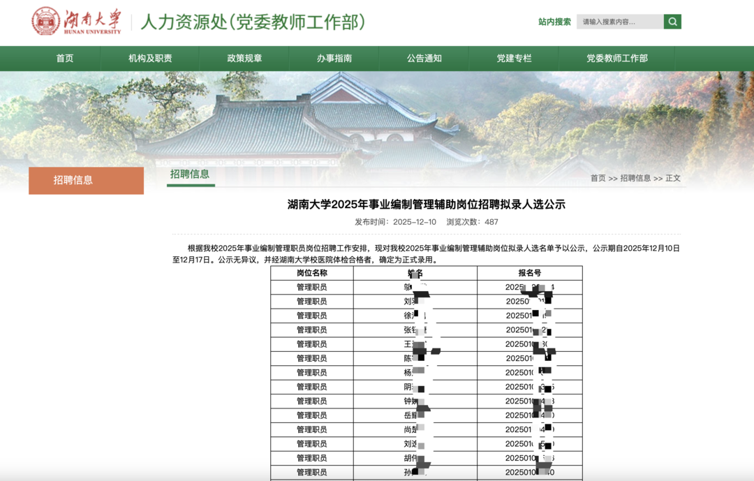就在“全网最忙五人组”事件闹得满城风雨的同时,有网友发现,湖南大学近日发布的一则事业编岗位招聘拟录人选公示文件中,仅公示了岗位名称和报名号,公众根本无从得知录取人员具体姓甚名谁。面对质疑,湖南大学人力资源处工作人员回应称,是系统匹配故障所致,已第一时间紧急处理。目前公示名单已完整呈现报名号、岗位信息及姓名。