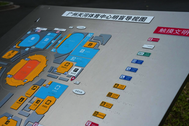 广州天河体育中心的无障碍导览台,藏着不少暖心的细节。盲文标注不仅方便视障人士触摸阅读,还特别选用热惰性较高的材料,即便天气炎热也不会烫手。导览台被刻意设计得更矮,方便轮椅使用者轻松触摸;不同的功能区用鲜艳颜色区分,照顾了弱视人群的辨认需求。在深圳市体育中心,所有的台阶都已改造成平缓坡道,龙岗国际自行车赛场更是增设了荧光盲道与智能升降平台,搭配高对比度标识与触觉导航设计,彻底消除了台阶的障碍……这些改造不仅服务于赛事,更将无障碍理念渗透到城市的毛细血管中,让温暖在细节中流淌。