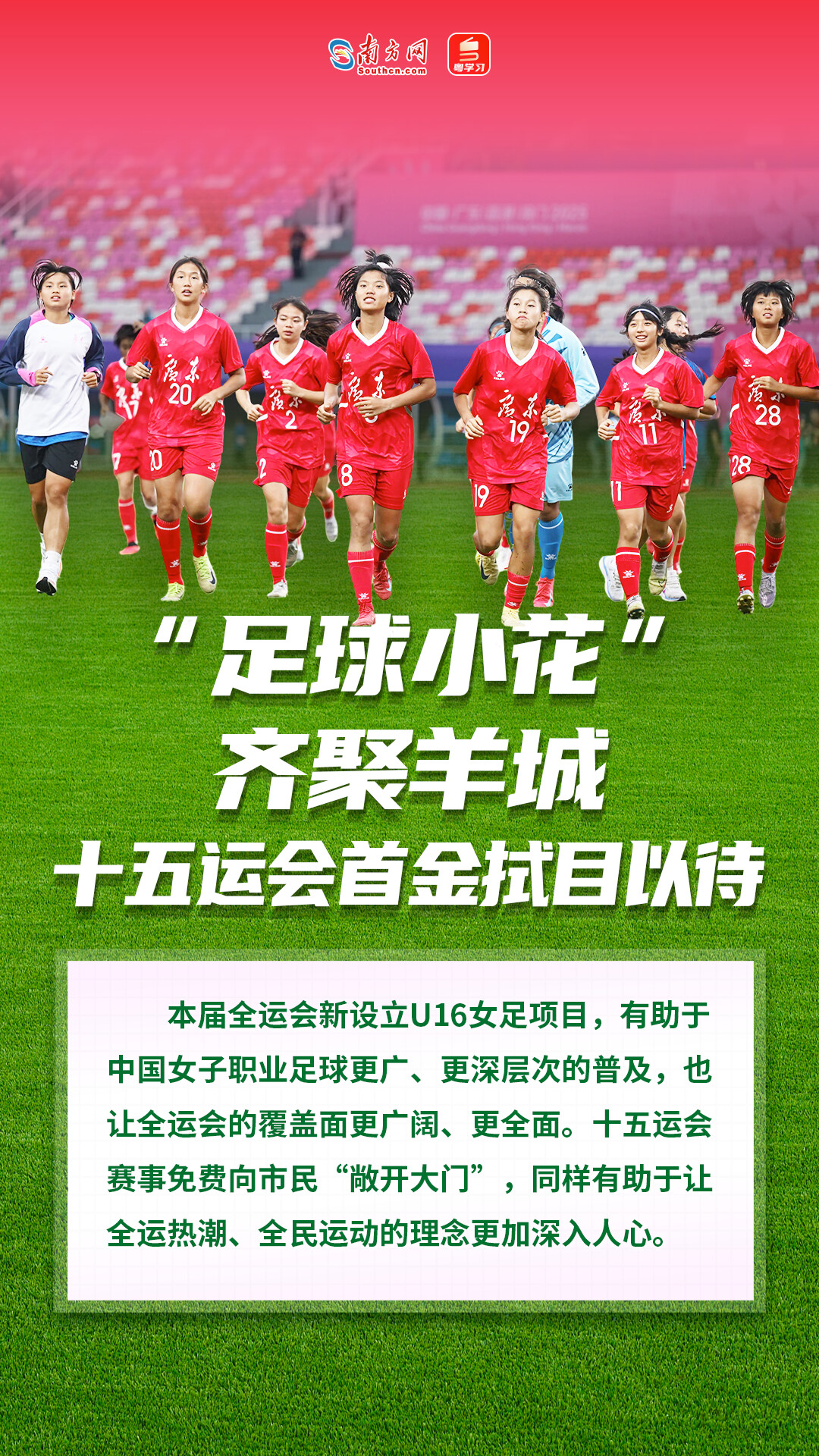 中国足球职业联赛正在如火如荼地进行。前不久,第十五届全国运动会(下称“十五运会”)群众七人制男子足球赛在佛山圆满举行。5月30日,十五运会足球项目女子16岁以下组比赛(U16女足赛)也在广州正式拉开帷幕,12队国内同年龄段最优秀的“足球小花”将齐聚羊城决出冠军。这是本届全运会的首个竞体项目,将产生十五运会真正意义上的首枚金牌。虽然离十五运会正式开幕还有160多天,但全运热潮已经席卷了南粤大地。